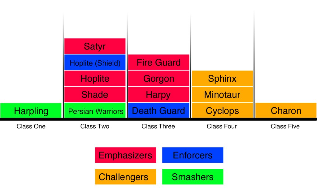 A balanced cast is one diverse in style, complexity, and mechanic. In the old days, it was as simple and clean as a “skinny”, “medium”, and “fat” hockey player, but now balance has a more textured meaning. In God of War they break enemies down into several classes, which ensures clarity in discussion, ensures designers (and others) visualize their workload, and ensures there is a properly distributed variation in play. Classes range from “Pests” which contains all of the lightweight annoying enemies, all the way to “Bosses” which, obviously, tracks the bosses.
